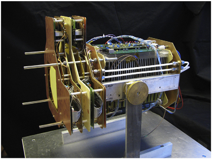 Project AQUA, an initiative that tries to advance the research on hadron therapy, makes use another kind of setup, named PRR10 (Amaldi et al., 2011). This group uses a pair of Gas Electron Multipliers to track protons and a stack of thin silicon plates to measure the range and therefore energy of the proton (figure 4). The whole device is rather compact, and the stated purpose is real-time imaging with sub mm accuracy and a range accuracy of a “few” percent, using