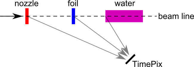 With the argument that objects in the beam scatter beam particles and generate secondary ions, Jakubek et al. (2012) in Prague propose a detector placed outside the beam to capture some of these stragglers. The problem of scattering is turned into a detection mechanism, because at the interface of materials with different densities, there is an increase in scattering. Using a stack of 2D silicon detection grids, TimePix chips, a 3D tracker is made. It is proposed that with such a setup the whole beam line can be imaged (figure 6), primarily to use for real-time beam verification. An energy measurement is not reliable since energy information is often lost in the scattering. Henriquet et al. (2012) suggest that therapy with heavier ions might be monitored with a scatter detector, because heavier ions generate secondary protons especially at the interface between bone and other tissue.