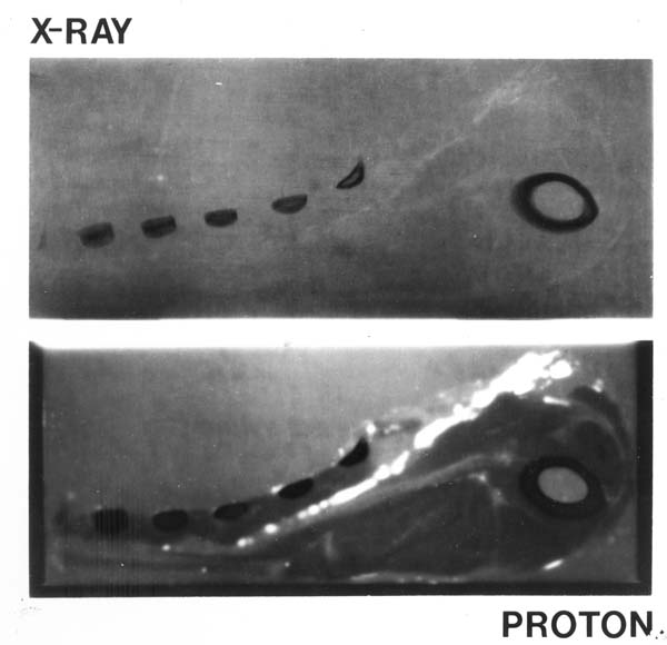 Figure 1: A comparison of an X-ray image (top) and a proton image (bottom) of a lamb chop, the first published proton image by Koehler (1968).