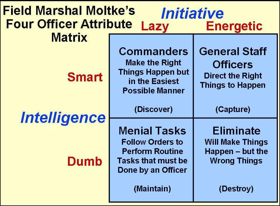 Veldmaarschalk Helmuth Karl Bernhard Graf von Moltke (1800-1891, Pruisen), en veldmaarschalk Erich Von Manstein (1887-1973, Duitsland) enkele jaren later, beiden beroemde strategen hadden een interessante kijk op het karakteriseren van hun manschappen. Eerst even de tabel van Moltke, dan de kwoot van Manstein:
